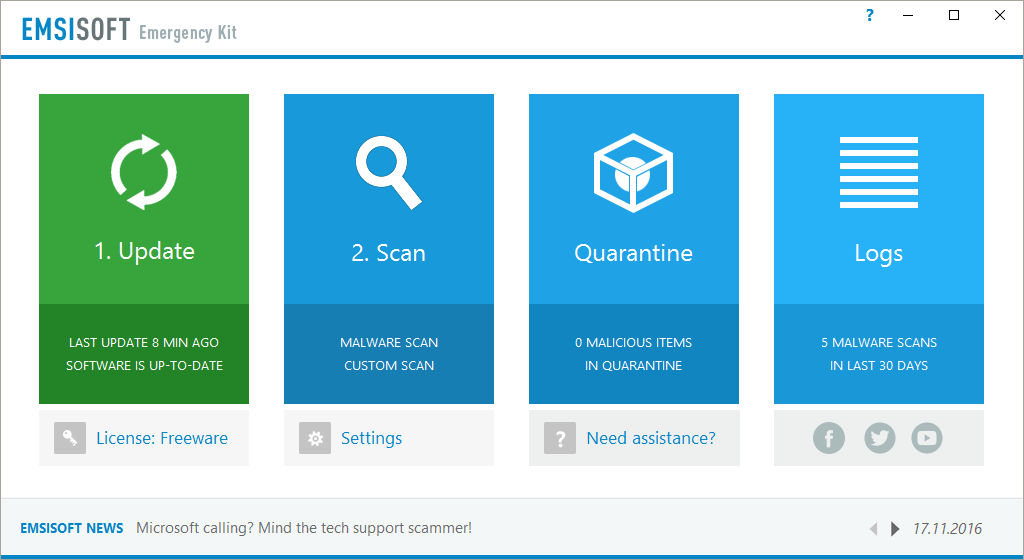 Emsisoft Emergency Kit es un potente y gratuito escáner bajo demanda que utiliza la misma tecnología que el anti malware normal de Emsisoft y puede utilizarse para eliminar virus, troyanos, spyware, adware, gusanos y otros programas maliciosos. Está diseñado para usarse junto a otros programas de seguridad ya instalados sin generar conflicto. Escanea el ordenador rápidamente y la principal ventaja es que se ejecuta directamente desde una unidad externa, ya sea USB, CD/DVD o disco duro externo.